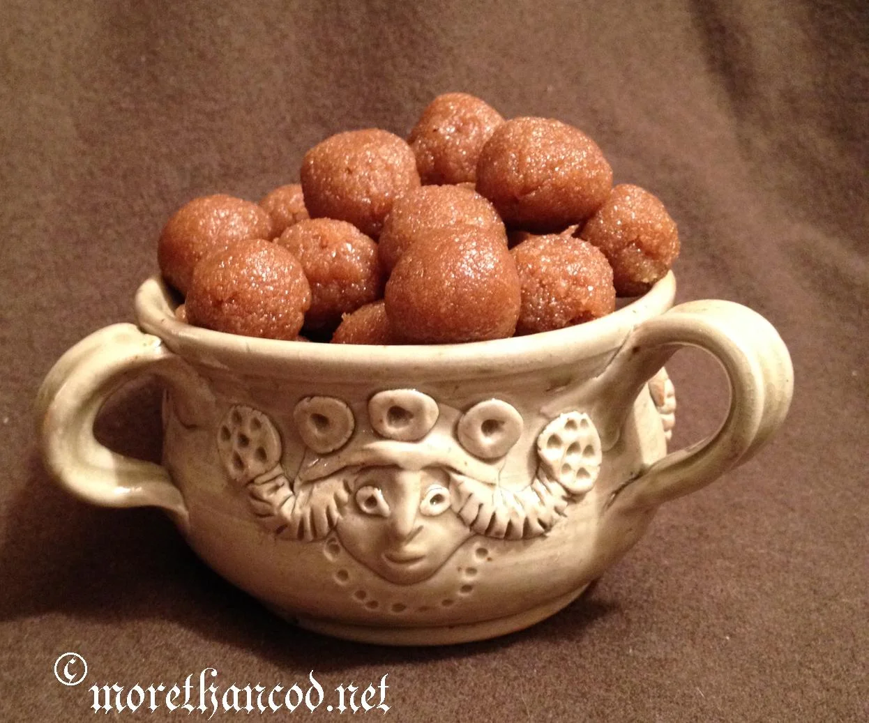 Bring the honey to a boil, skim, then boil gently 2-3 minutes. Mix in spices and allow these to infuse for a minute or two before gradually stirring in the bread crumbs. Mix thoroughly. Allow to cool slightly then form into gumball sized balls and allow to cool thoroughly on a lightly buttered plate. (A little butter on the spoon/fingers will make shaping the balls easier).